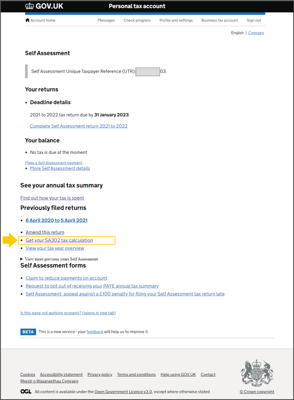5. Kliknij link ‘view account’ lub ‘View Self Assessment return for tax year 20xx to 20xx' lub 'View your tax year overview'