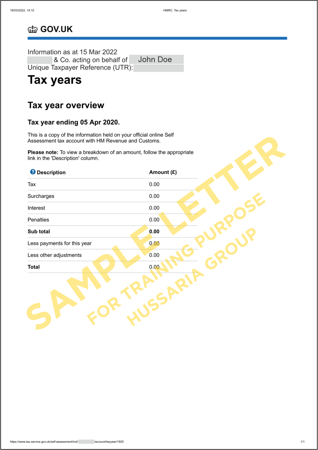 PRZYKŁADOWY DOKUMENT Tax Overview 1 Potwierdzenie Podsumowania Roku podatkowego z HMRC
